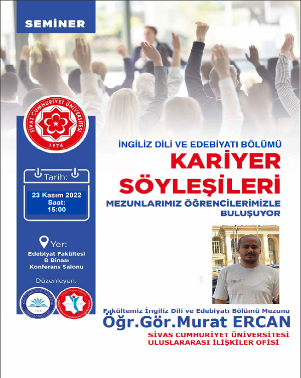 Fakültemiz İngiliz Dili ve Edebiyatı Bölümü tarafından Kariyer Söyleşileri kapsamında ''Mezunlarımız Öğrencilerimiz ile Buluşuyor'' konulu seminer 23.11.2022 tarihinde saat 15.00'te B binası konferans salonunda düzenlenecektir.