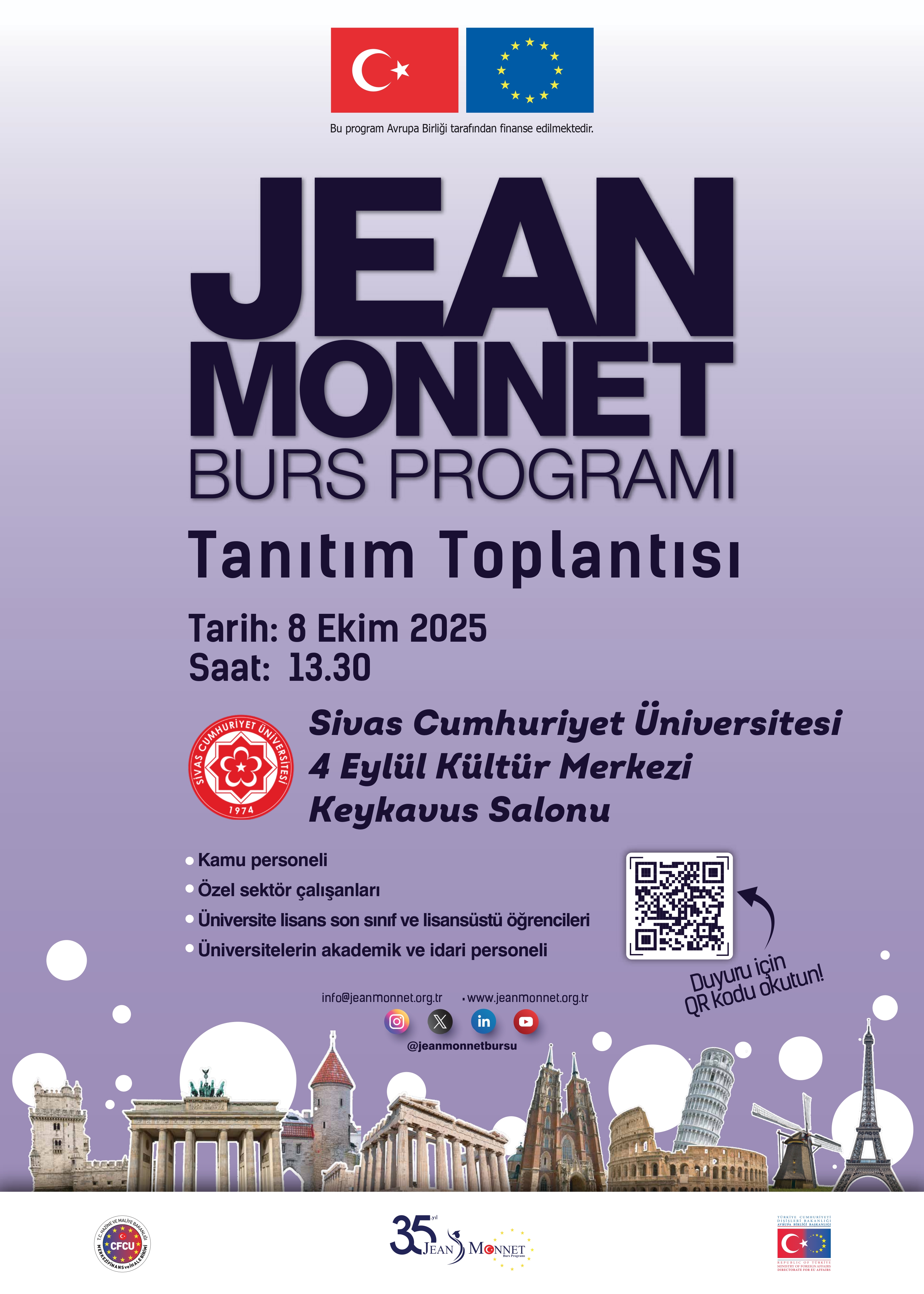 Jean Monnet Burs Programı,1989 yılında Türkiye Cumhuriyeti ile Avrupa Komisyonu arasında imzalanan bir anlaşma ile hayata geçirilen ve kamu personeli, özel sektör çalışanları, üniversite lisans son sınıf ve lisansüstü öğrencileri ile üniversitelerin akademik ve idari personeline, en az 3 ay, en fazla 12 ay süreyle AB üyesi ülkelerde bulunan bir üniversite veya üniversiteye eşdeğer bir kuruluşta araştırma yapma veya lisansüstü eğitim görme imkânı sunan bir burs programıdır. Söz konusu program hakkında bilgilendirme amacıyla, 8 Ekim 2025 tarihinde saat 13.30'da 4 Eylül Kültür Merkezi Keykavus Salonu'nda T.C. Dışişleri Bakanlığı Avrupa Birliği Başkanlığından üç uzmanın katılacağı bir tanıtım toplantısı düzenlenecektir.