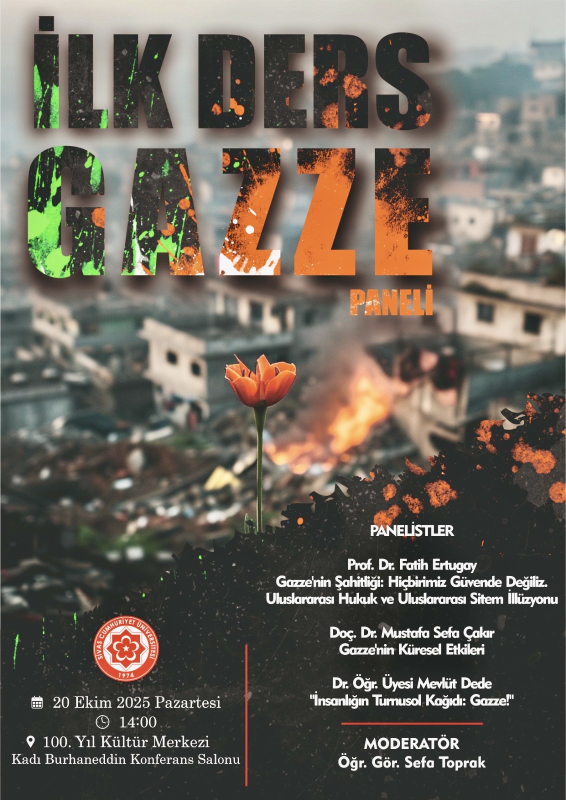 ''İlk Ders Gazze'' konu başlıklı panel programı 20 Ekim 2025 Pazartesi günü saat 14.00' te Üniversitemiz 100. Yıl Kültür Merkezi Kadı Burhaneddin Konferans Salonunda gerçekleştirilecektir.
