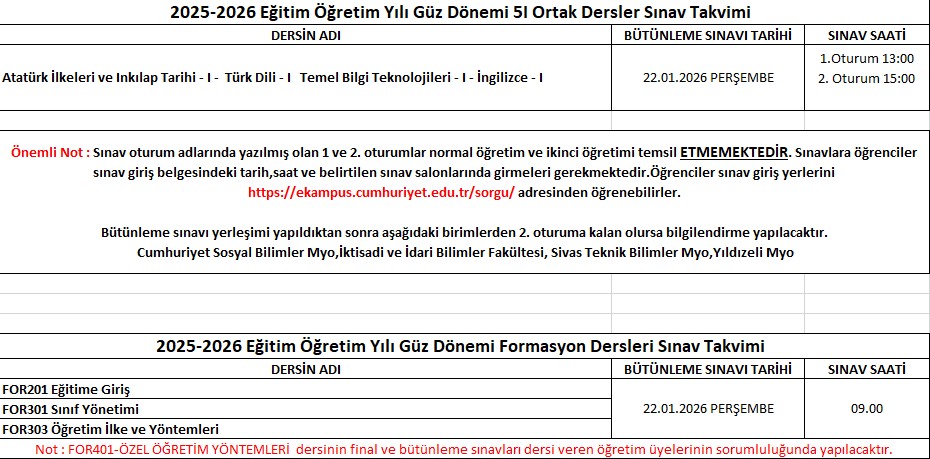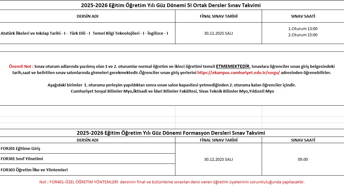 2025-2026 eğitim-öğretim yılı güz dönemi 5i ortak derslerin ve Pedagojik Formasyon derslerinin final ve bütünleme sınav takvimi Ek'te sunulmuştur.
