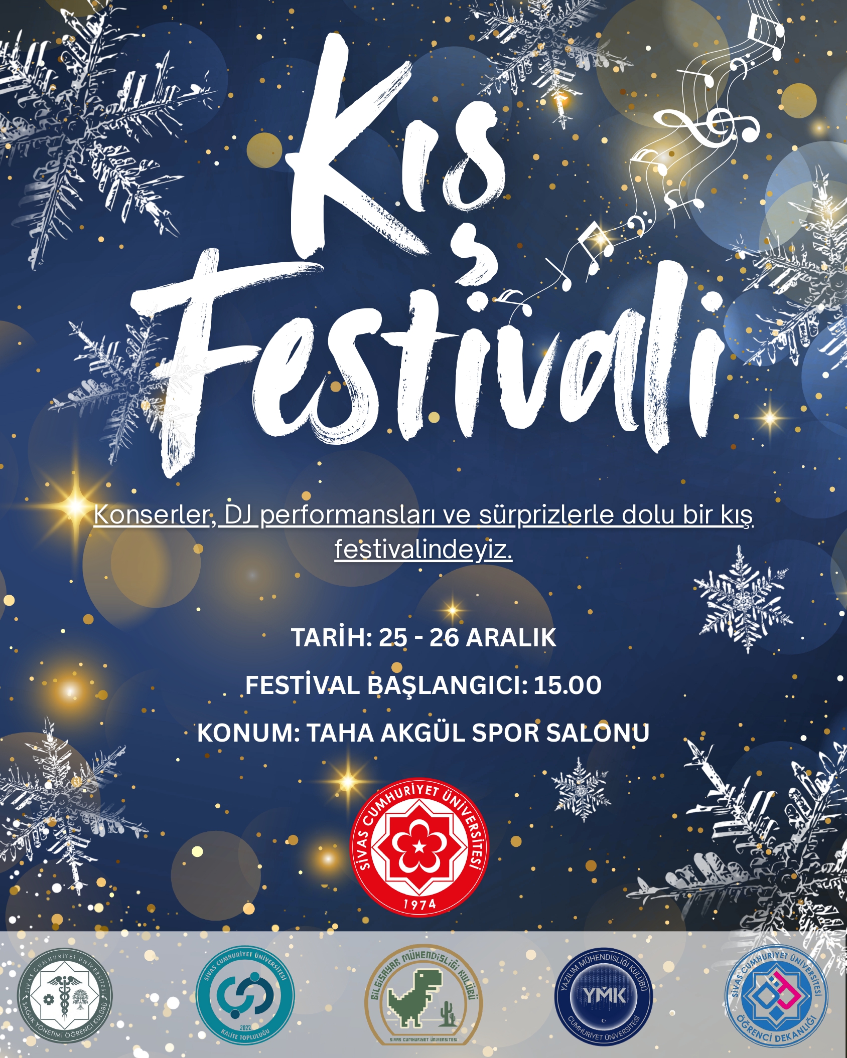 Üniversitemizde 25-26 Aralık 2025 tarihleri arasında düzenlenecek olan, birçok etkinliği kapsayan "Kış Festivali" ne ilişkin afiş ektedir.