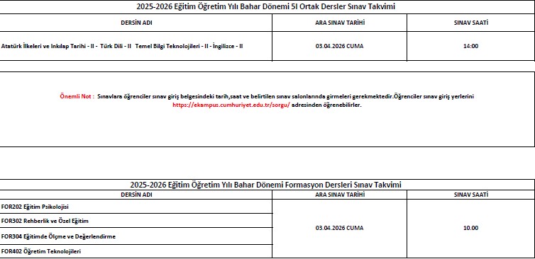 2025-2026 Eğitim Öğretim Yılı Bahar Dönemi 5i Ortak Dersler ve Pedagojik Formasyon Dersleri Ara Sınav Takvimi